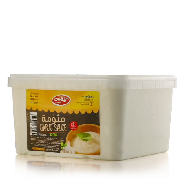 ثوم، مايونيز، نشا، ملح طعام، ملح الليمون، مواد مثبتة، مواد حافظة (E211, E202).